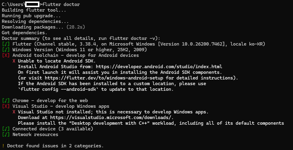 [!] Flutter (Channel stable, 3.38.4, on Microsoft Windows [Version 10.0.26200.7462], locale ko-KR)