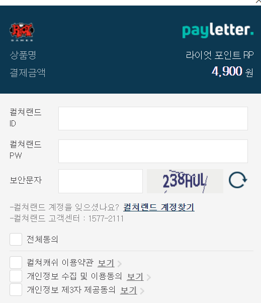 그 후 자신의 캐시가 충전된 문화상품권 컬쳐랜드 아이디와 비밀번호를 입력해 게임머니를 충전해 주면 되겠습니다!