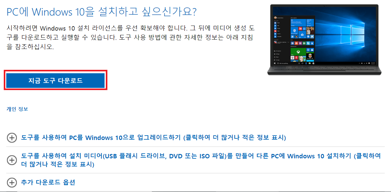 '지금 도구 다운로드' 버튼을 눌러 파일을 받아주고