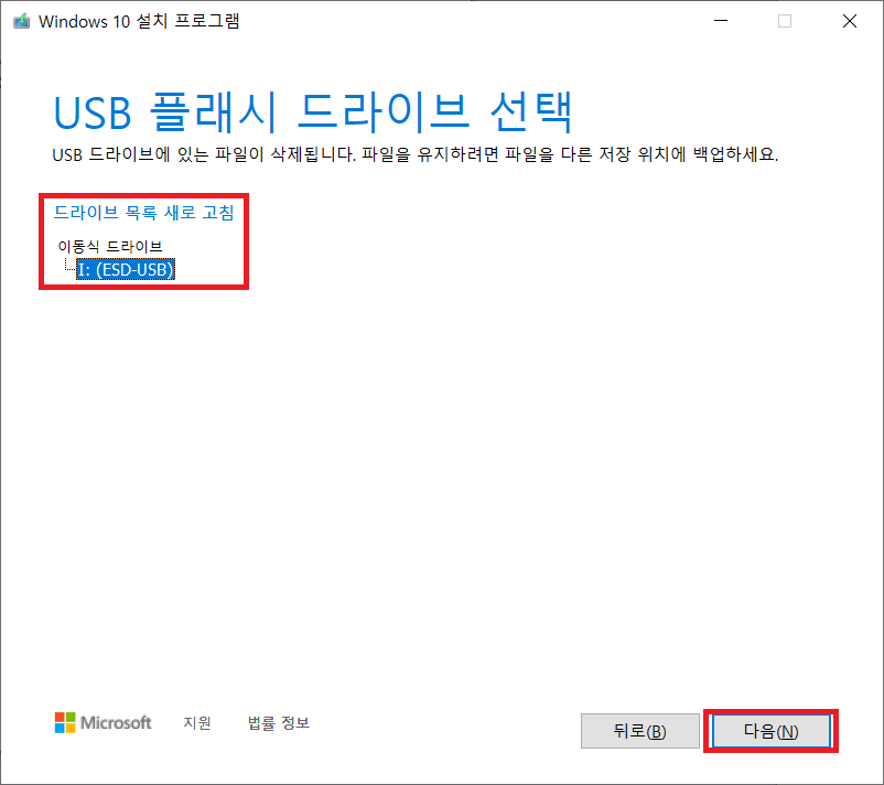 'USB 플래시 드라이브' 버튼을 클릭해주어야 합니다